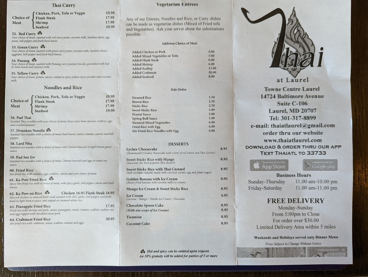 Whether you're a first-time visitor or a loyal patron, Thai At Laurel consistently delivers on both flavor and quality, making it a must-visit destination for Thai cuisine lovers.